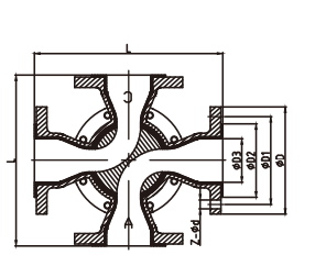 2、本閥設(shè)計為四通圓弧式通道分流體,閥芯設(shè)計為帶頂尖式圓弧結(jié)構(gòu),實現(xiàn)全開時流道暢通無阻力。
