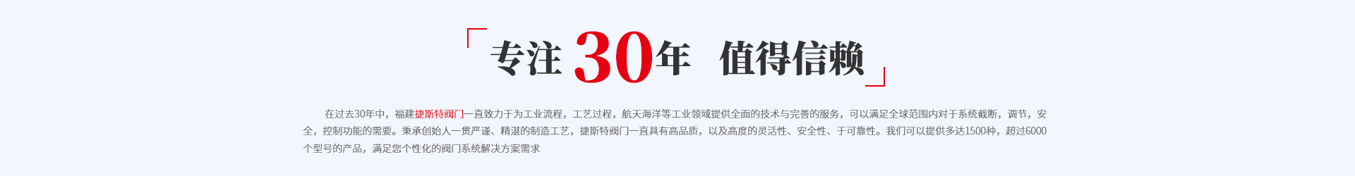 福建捷斯特閥門30年來專注閥門,重視技術創新;注重產品質量。經過30年的發展,捷斯特閥門現擁有快速旋轉閥、輸灰漿渣組合閥、新技術自帶破冰罐底閥、安耐特節能閥、耐酸納米新技術管道、新型視鏡、新型高性能蝶閥、新型高溫高壓電站閥等38項產品以及各類閘閥、截止閥、止回閥、球閥、蝶閥共1500余種,6000多個型號系列,其中具有自主知識產權的特種材料閥門(鈦閥門、鎳閥門、鋯閥門、鉭閥門、哈氏合金閥門、蒙乃爾合金閥門等)、特殊結構閥門與耐酸耐蝕、抗沖刷耐磨損閥門總銷量在中國首屈一指。